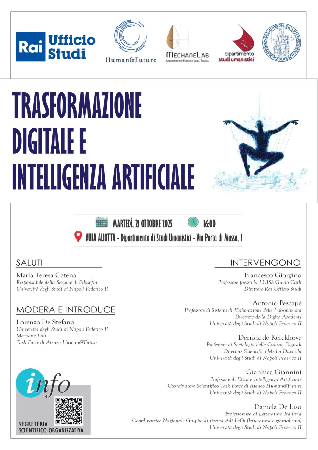 Incontro in presenza dedicato al tema della trasformazione digitale e dell’intelligenza artificiale, con l’obiettivo di approfondire l’impatto delle nuove tecnologie sui processi culturali, sociali e comunicativi. Saranno presentati i volumi Trasformazione Digitale e Intelligenza artificiale. Una mappa delle sfide dei media del Servizio Pubblico e il nuovo lavoro del prof. De Kerckhove L’Uomo Quantisitico, entrambi editi da RAI Libri.