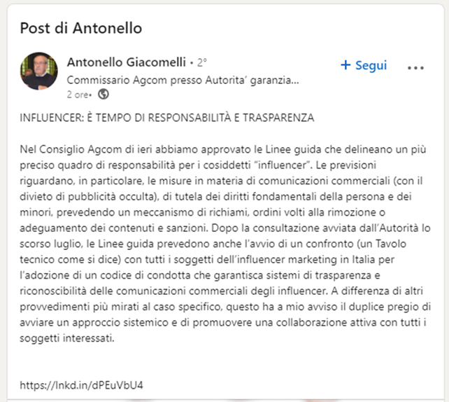 Influencer è tempo di responsabilità e trasparenza ha commentato Antonello Giacomelli, Commissario Agcom.