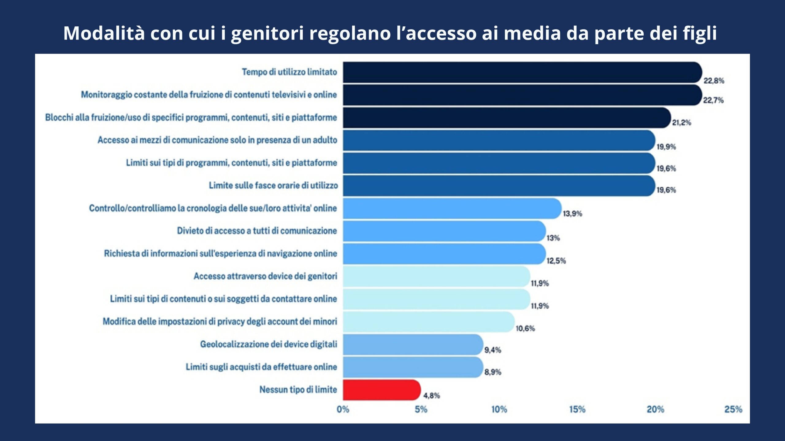 Cosa fanno gli italiani e le famiglie di fronte ai contenuti a rischio. Otto italiani su dieci mettono in atto almeno una forma di contrasto: la metà evita piattaforme che veicolano contenuti pericolosi, ma solo un terzo verifica la fonte delle notizie. La verifica e la segnalazione sono pratiche più frequenti tra chi ha un titolo di studio elevato. La sensibilità delle famiglie cresce: l’80% dei genitori adotta qualche forma di controllo sull’uso dei media da parte dei figli. Le strategie variano a seconda del livello di istruzione ed età: i genitori più anziani e laureati preferiscono il monitoraggio condiviso (co-using), mentre i più giovani e meno istruiti optano per limiti rigidi o divieti.
