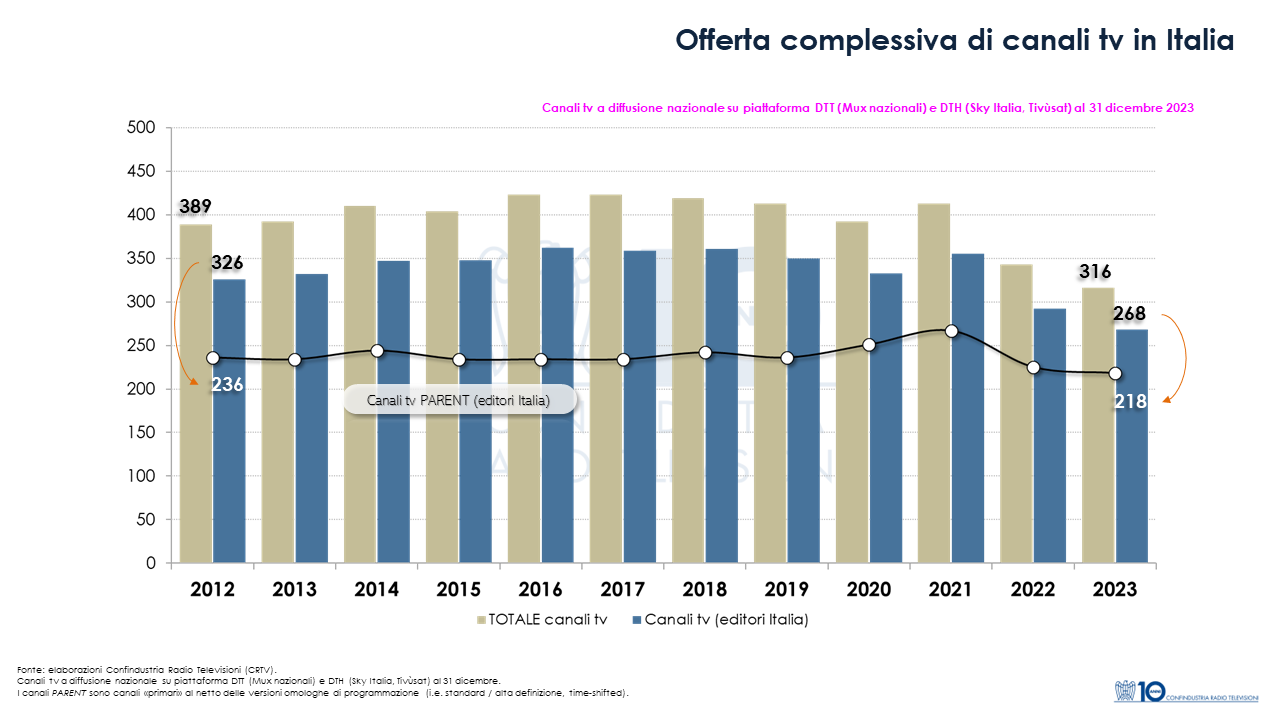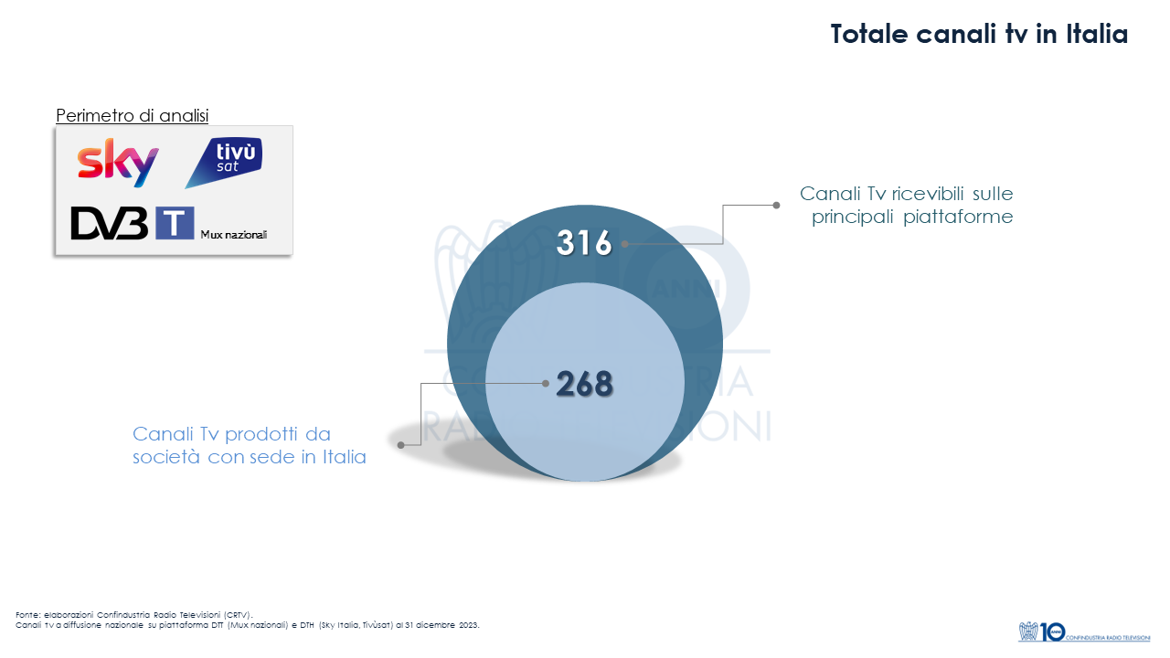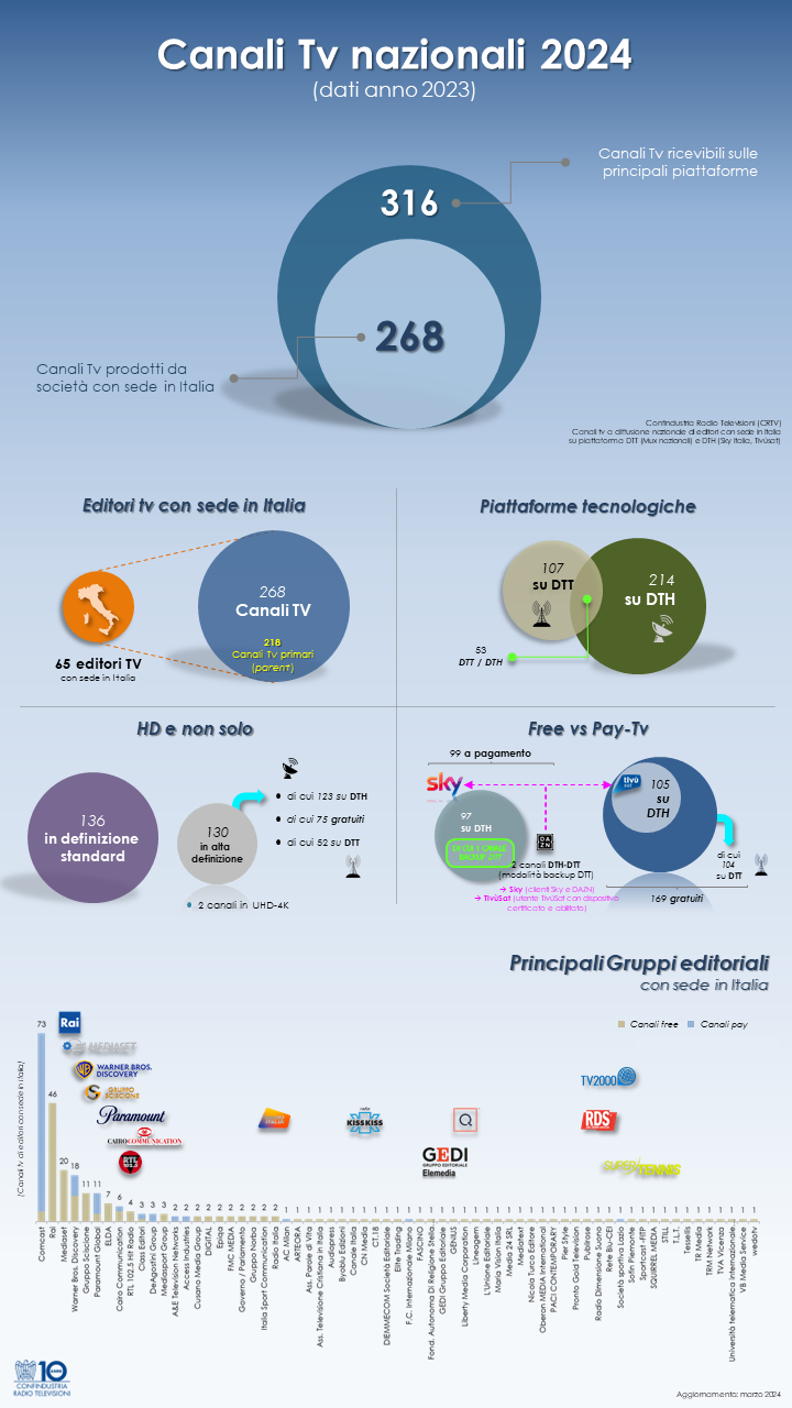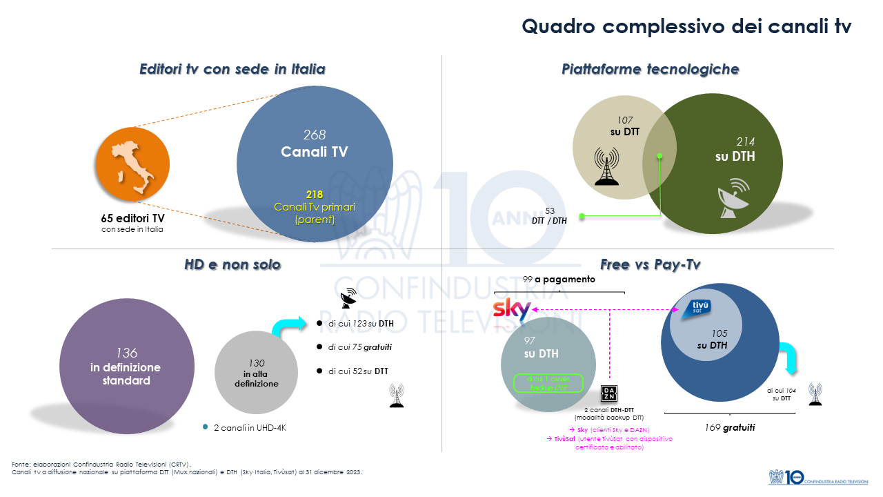 [32] Il perimetro di analisi è relativo ai canali tv a diffusione nazionale su piattaforma DTT (Mux nazionali) e DTH (Sky Italia, Tivùsat) al 31 dicembre 2023.