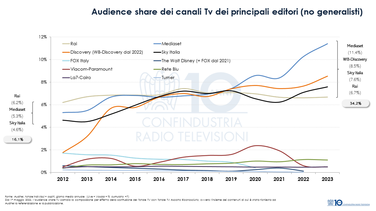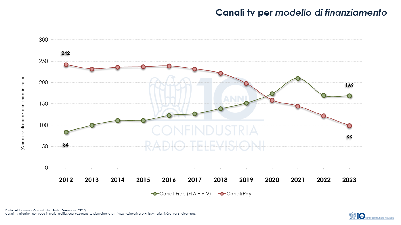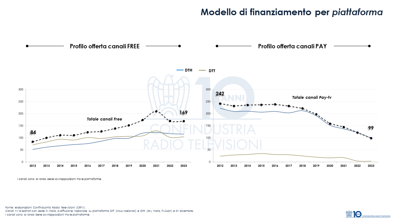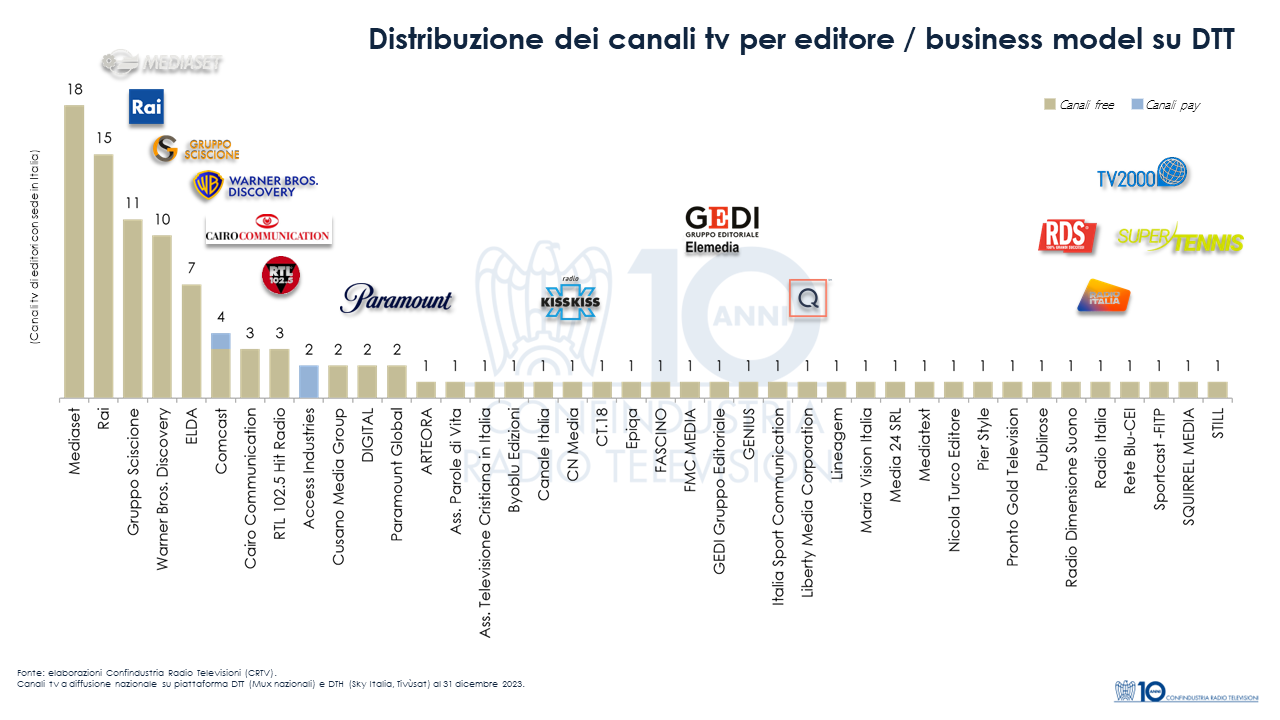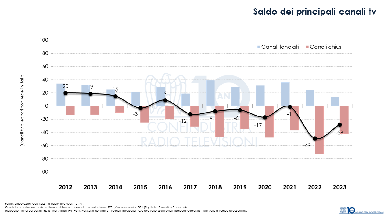 [32] Il perimetro di analisi è relativo ai canali tv a diffusione nazionale su piattaforma DTT (Mux nazionali) e DTH (Sky Italia, Tivùsat) al 31 dicembre 2023.
