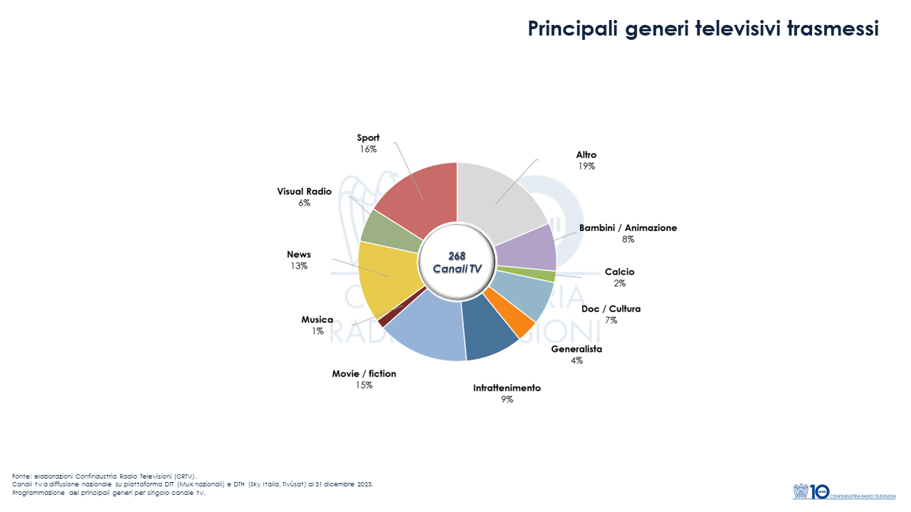 In termini di programmazione televisiva, [40] si rileva che, nel 2023 sui 268 canali tv, quelli dedicati al genere Sport & Calcio cumulano la quota maggiore (18%), seguiti da Cinema & Serie tv (15%), News (13%) e Intrattenimento, includendo il sottogenere factual entertainment (9%).