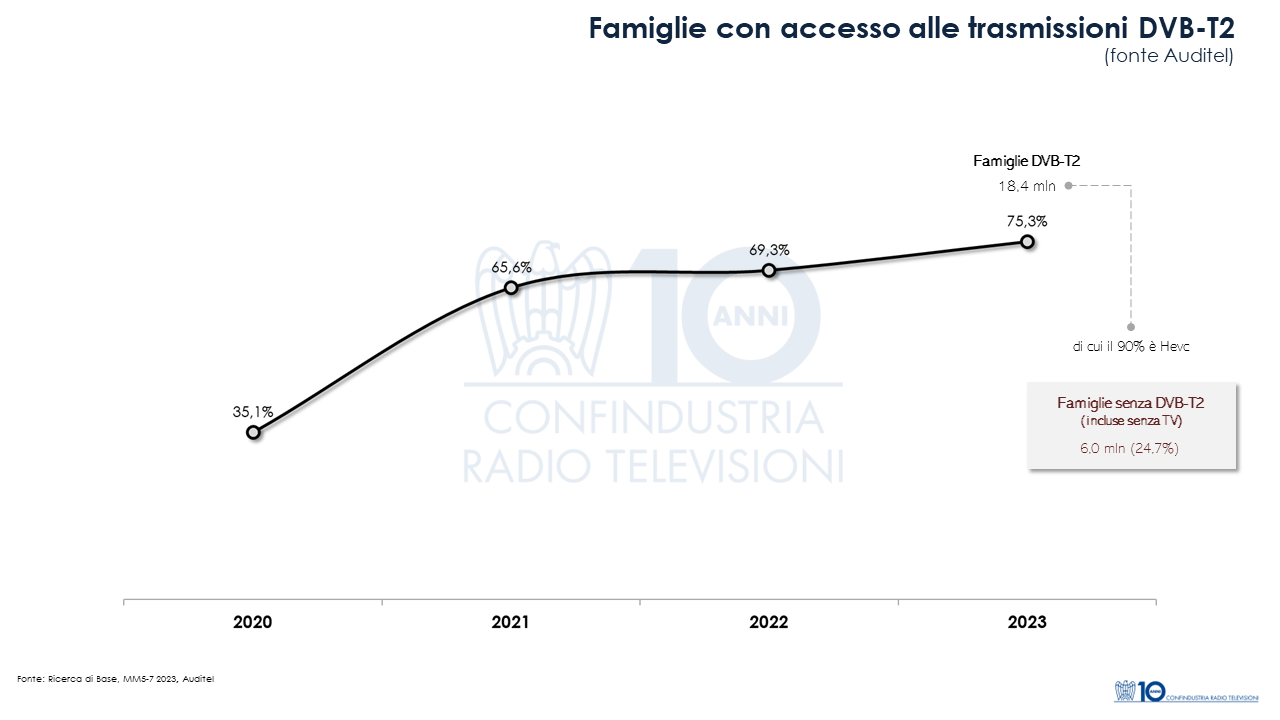 A un anno di distanza (dicembre 2023), sono circa 18,4 milioni le famiglie su 24,5 milioni dotate di almeno un apparecchio DVB-T2 (75% del totale) e ancora oltre 5 milioni le famiglie con tutti gli apparecchi DVB-T (le restanti sono prive di TV). [2]