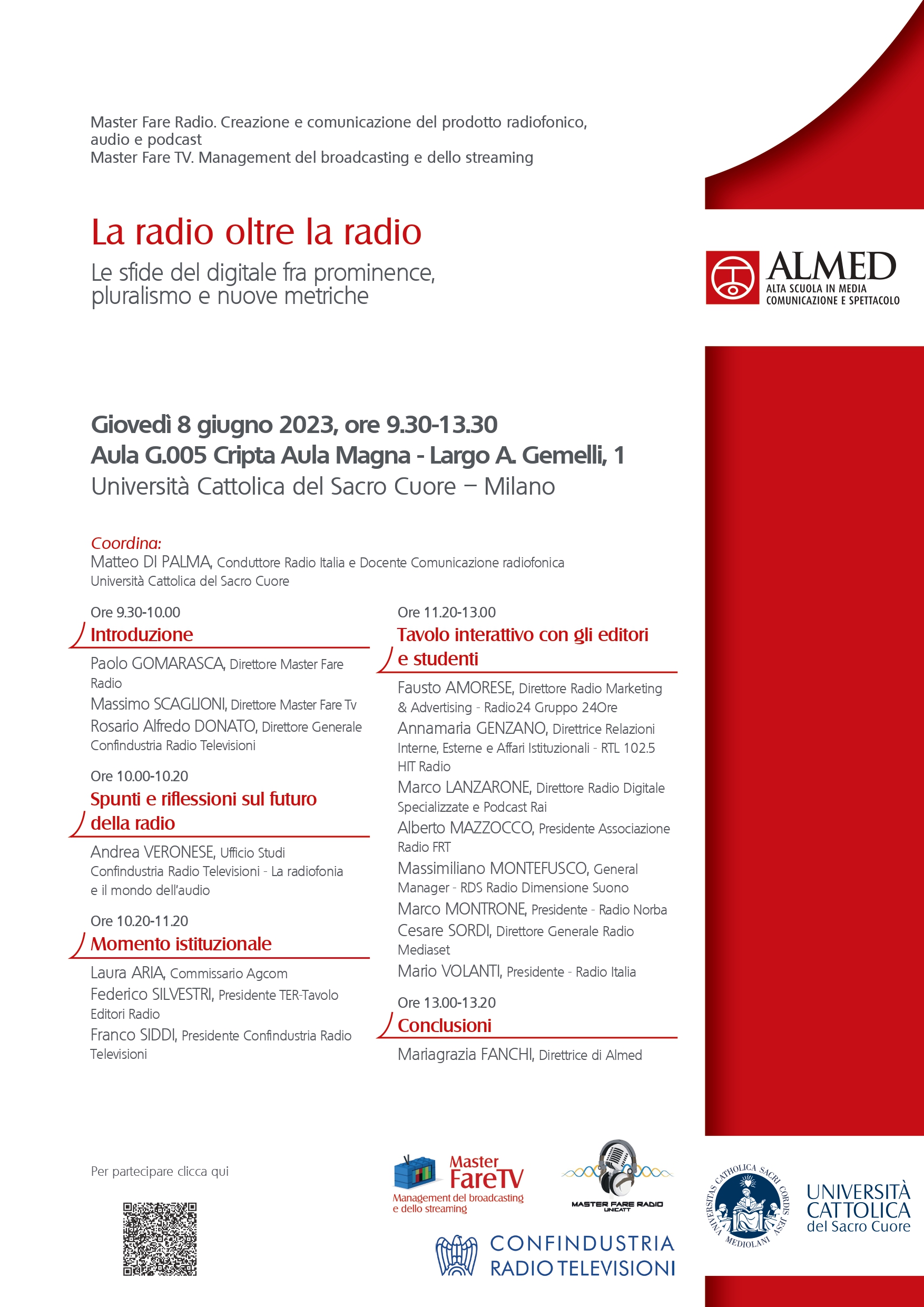 Hanno partecipato Laura Aria e Massimiliano Capitanio (AGCOM), Patrizia Catenacci (MIMIT), Rosario Alfredo Donato (CRTV), Monica Gallerini (FCP Assoradio), Anna Maria Genzano (Audiradio), Marco Rossignoli (Aeranti Corallo). Liberare il potenziale delle radio accomuna tutti i contributi – regolatore, amministrazione, referenti di mercato, associazioni – e tutti i temi toccati – prominence, frequenze, ascolti, diritti connessi .