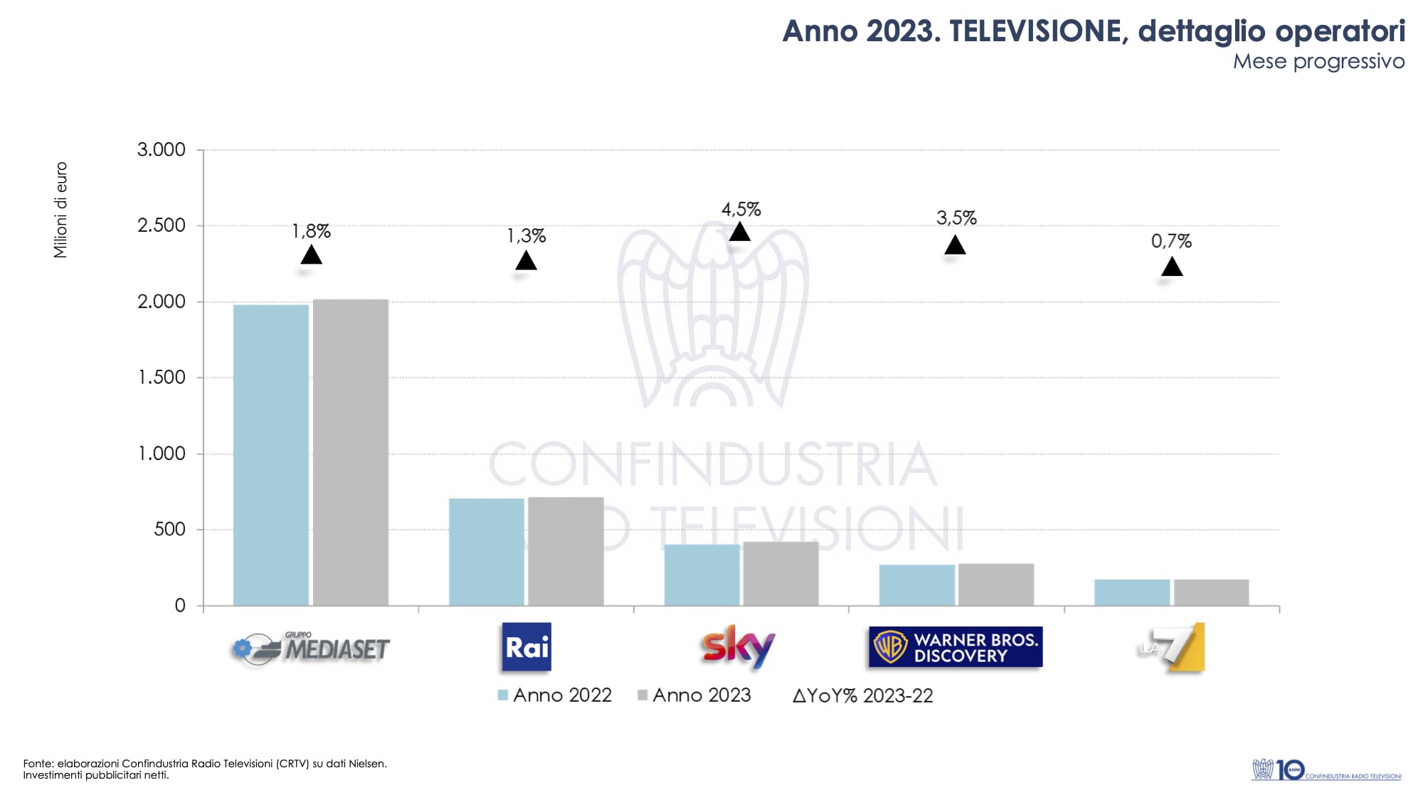 La Televisione chiude l’ultimo anno con un andamento caratterizzato da un sostanziale miglioramento, soprattutto nei mesi autunnali. Nel singolo mese di dicembre, la Televisione registra una diminuzione dell’1,2%, totalizzando su base annua 3,6 miliardi di euro circa che porta ad una crescita cumulata del 2,1% (+74 milioni di euro circa rispetto al 2022).