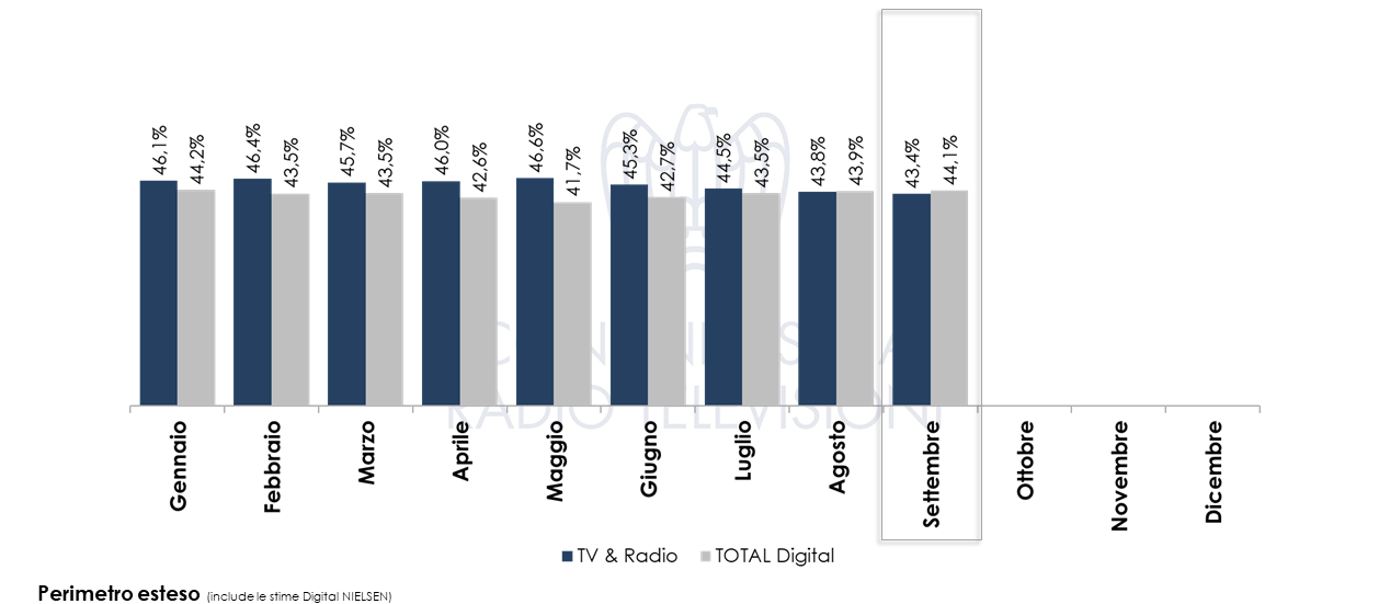 Tale valore mostra un andamento (+2,5% a settembre e +3,7% a livello cumulato) nettamente al di sotto delle performance degli altri anni in termini di crescita, e, nel periodo considerato, rappresenta circa l’88% del valore degli investimenti pubblicitari online (stima Digital Nielsen). In generale, il mezzo nella sua dimensione TOTAL Digital risulta cumulare una quota di mercato sul perimetro esteso pari al 44,1% (42,3% a settembre 2021), la Televisione insieme alla Radio mantengono una quota del 43,4%.