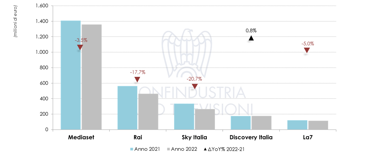 Nel dettaglio, Mediaset totalizza una raccolta cumulata nel periodo considerato (gen-set) pari a circa 1,36 miliardi (-3,5%), Rai 463,7 milioni di euro (-17,7%), Sky Italia-Comcast 266,0 milioni circa (-20,7%), Warner Bros. Discovery Italia 177,3 milioni (+0,8%) e La7-Cairo Communication 115,6 milioni (-5,0%). Nel periodo considerato, il mezzo televisivo rimane sotto i valori pre-COVID di circa 100 milioni di euro (-4,1%).