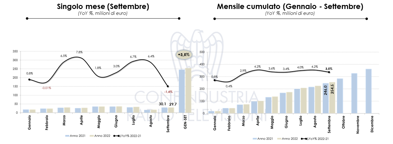 NIELSEN, Investimenti pubblicitari SETTEMBRE 2022: RADIOTV. Il settore totalizza nel periodo gennaio-settembre 2022 un investimento complessivo di circa 2,64 miliardi di euro, in calo del 7,5% rispetto all’anno scorso (2,85 miliardi di euro nel 2021). Nel singolo mese il valore degli investimenti Radiotv registra 321 milioni di euro circa in flessione del 6,2% rispetto all’anno precedente.