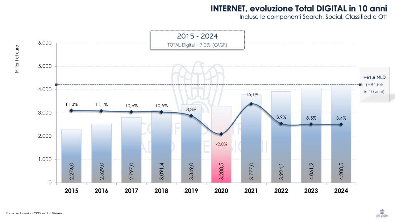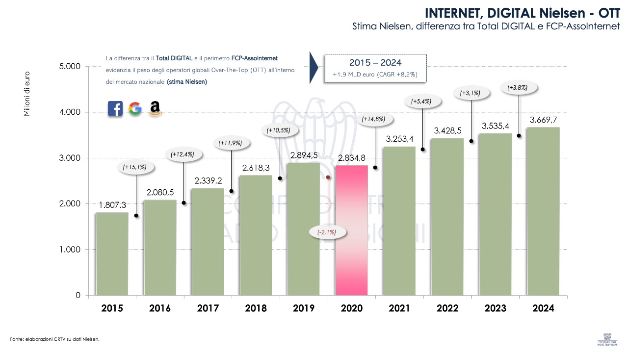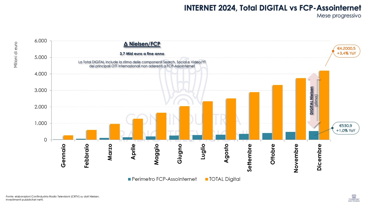 DIGITAL. Internet, relativamente al perimetro rilevato da FCP-AssoInternet, registra sull’intero anno un aumento dell’1,0%, attestandosi a 531 milioni di euro circa. Allargando il dato al perimetro stimato da Nielsen (inclusivo delle componenti Search, Social e Classified e dei cosiddetti Over-The-Top), il mezzo nella sua dimensione Total DIGITAL chiude i dodici mesi dell’anno a 4,2 miliardi di euro, con una crescita del 3,4%. Si ricorda che la differenza tra i due perimetri (FCP-Assointernet e TOTAL Digital Nielsen), pari a 3,67 miliardi di euro, è riferibile alla raccolta degli operatori globali (OTT) sul territorio nazionale (nel 2023 la differenza era di 3,54 miliardi di euro).