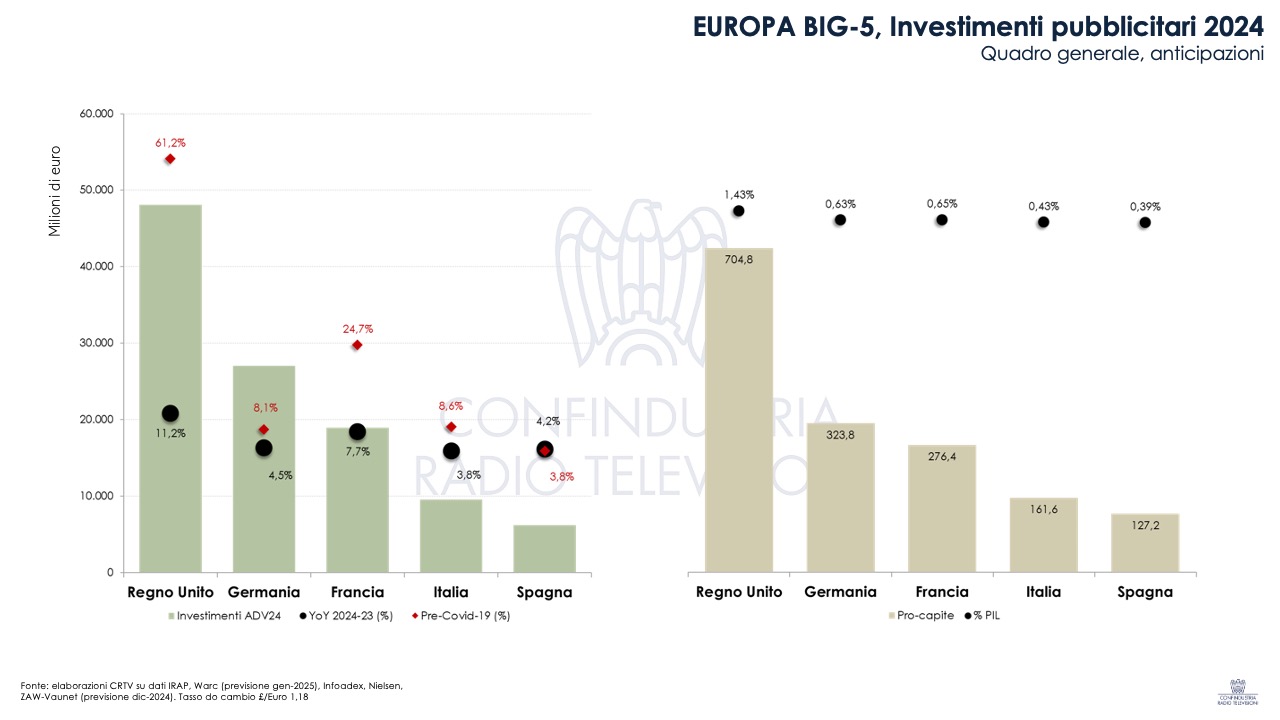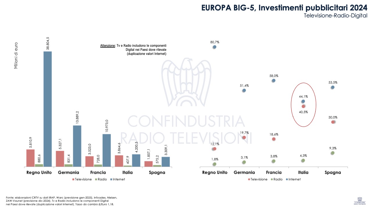 In tutti i Paesi (Big-5) ad eccezione dell’Italia, Internet distanzia ampiamente gli altri mezzi. Nel Regno Unito raggiunge una quota pari all’81% (38,8 miliardi di euro), segue la Francia con il 58% (11,0 miliardi), Spagna con il 53,5% (3,3 miliardi), Germania con il 51,4% (13,9 miliardi) e Italia con 44,1% (4,2 miliardi). Come indicato precedentemente la Televisione in Italia mantiene una quota del 40,5% mentre negli altri Paesi non supera il 30%, La Radio spazia tra il 2 e 9%.