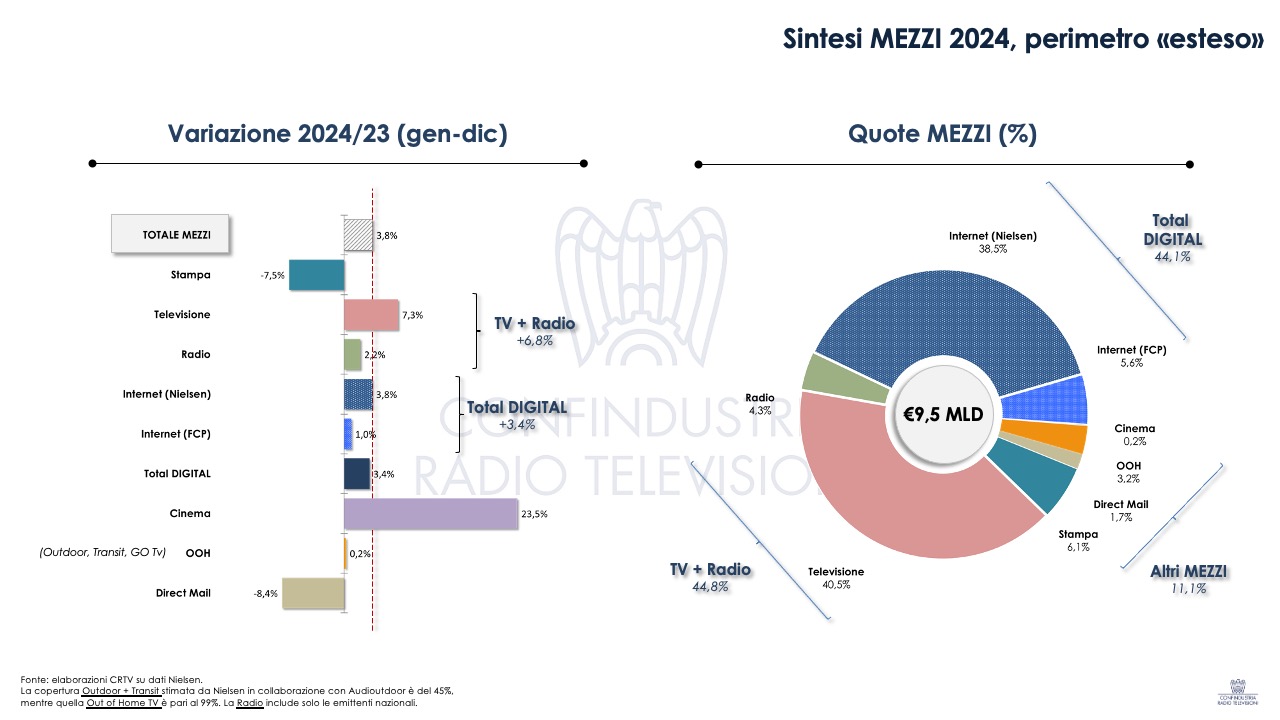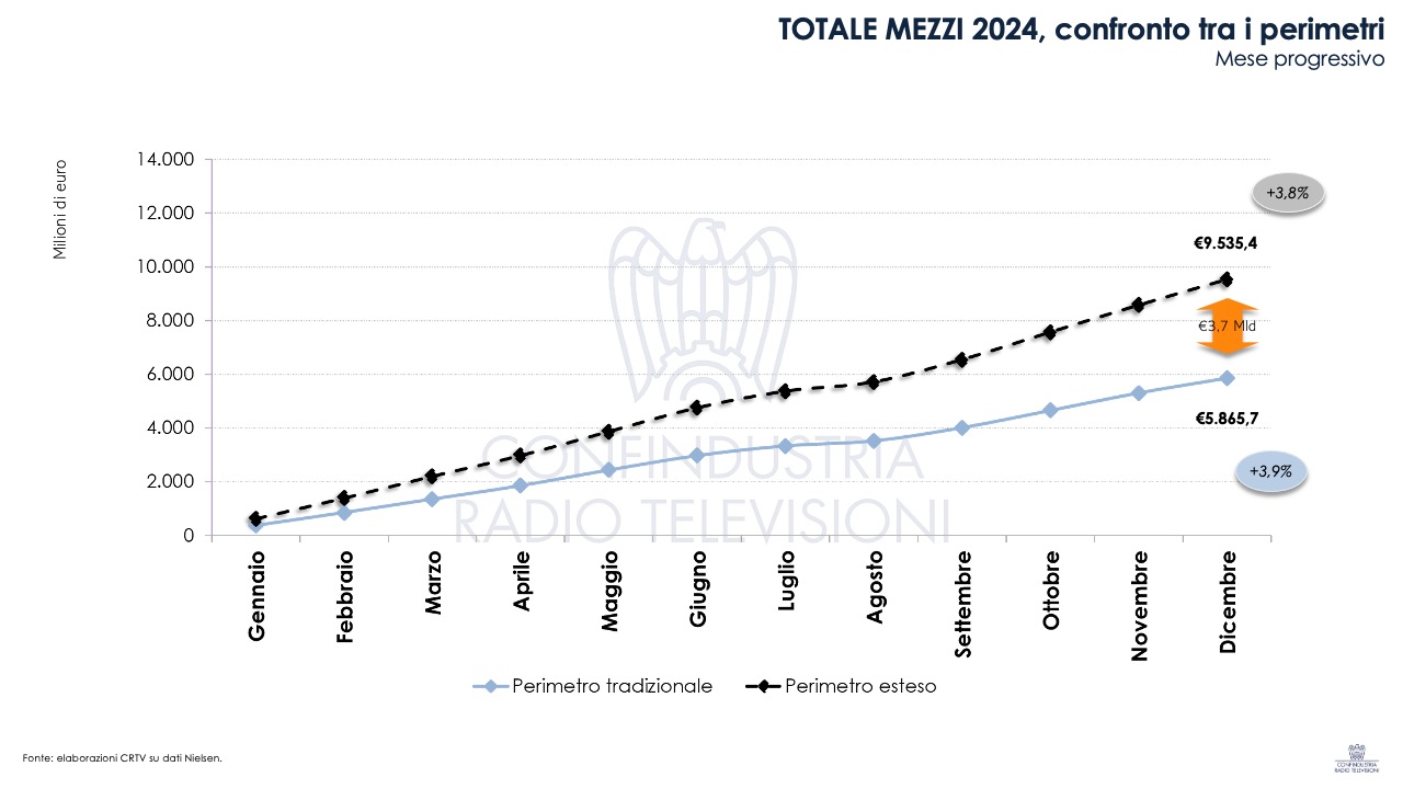 TOTALE MEZZI. Il mercato degli investimenti pubblicitari in Italia registra nel 2024 un valore complessivo superiore a 5,8 miliardi di euro, con un incremento del 3,9% (+219 milioni di euro) rispetto all’anno precedente (perimetro Nielsen “tradizionale”). Nel mese di dicembre, il dato si attesta a 550,3 milioni di euro circa con un decremento del 5,8% rispetto ai valori dello stesso mese nel 2023. In termini di perimetro “esteso” (includendo le componenti Search, Social e Classified di Internet e dei cosiddetti Over-The-Top), il valore del mercato si attesta a circa 9,5 miliardi di euro (+3,8% rispetto al 2023), con una differenza da quello “tradizionale” di poco inferiore a 3,7 miliardi di euro.