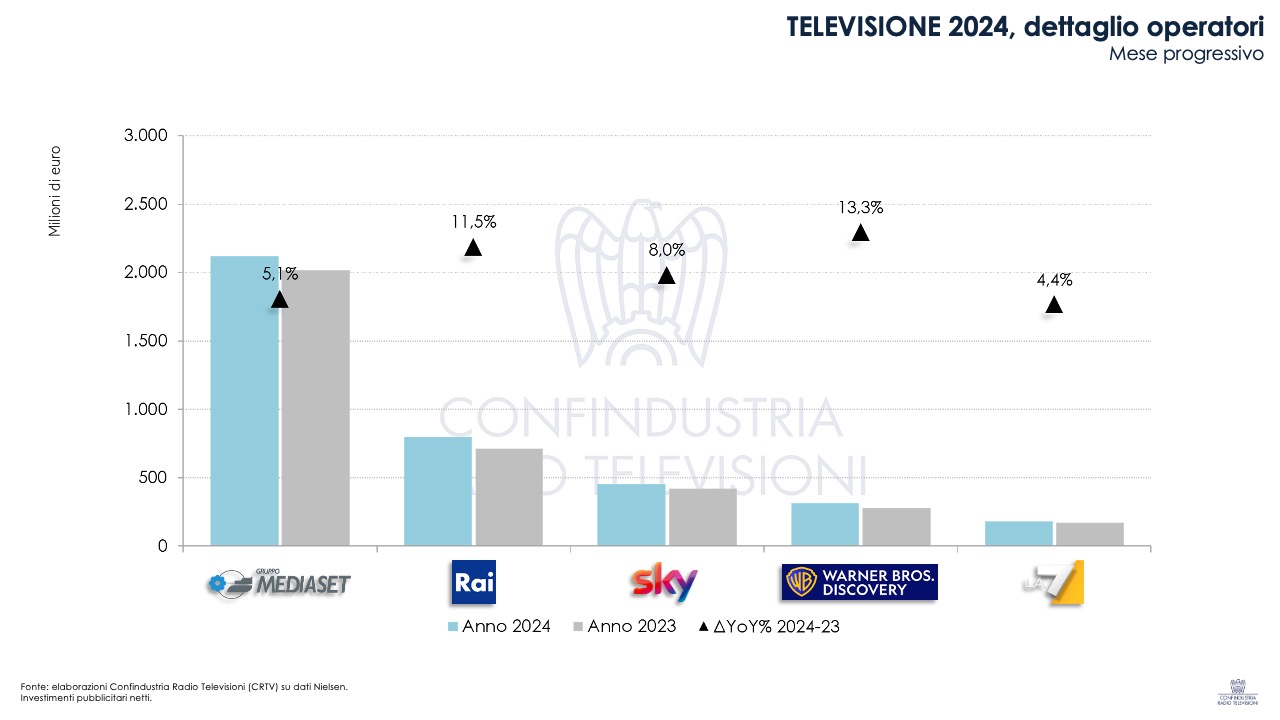 Nel dettaglio, Mediaset totalizza una raccolta di poco sopra ai 2,1 miliardi (+5,1%), Rai 795,0 milioni di euro circa (+11,5%), Sky Italia-Comcast 456,0 milioni circa (+8,0%), Warner Bros.Discovery Italia 314,0 milioni (+13,3%) e La7-Cairo 181,0 milioni (+4,4%). In aumento il confronto del mezzo rispetto ai valori pre-pandemici (+7,5% rispetto al 2019).