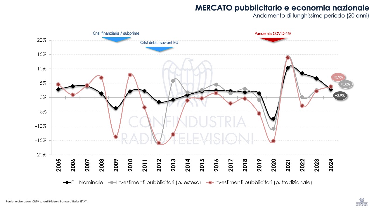 Nell’ultimo anno, l’economia nazionale mostra una crescita contenuta registrando un PIL a prezzi correnti (PIL nominale) pari a 2.192,2 milioni euro, in un aumento del 2,9% rispetto all’anno precedente (+0,7% a prezzi costanti). Le prospettive per il 2025 rimangono fortemente incerte dato l’acuirsi delle tensioni geopolitiche e l’annunciato inasprimento della politica commerciale statunitense. In questo contesto, il mercato pubblicitario ha mostrato una importante dinamicità, rimanendo sopra la soglia dei 9 miliardi di euro, grazie anche ai grandi eventi sportivi (Europei di calcio in Germania e Giochi Olimpici di Parigi).
