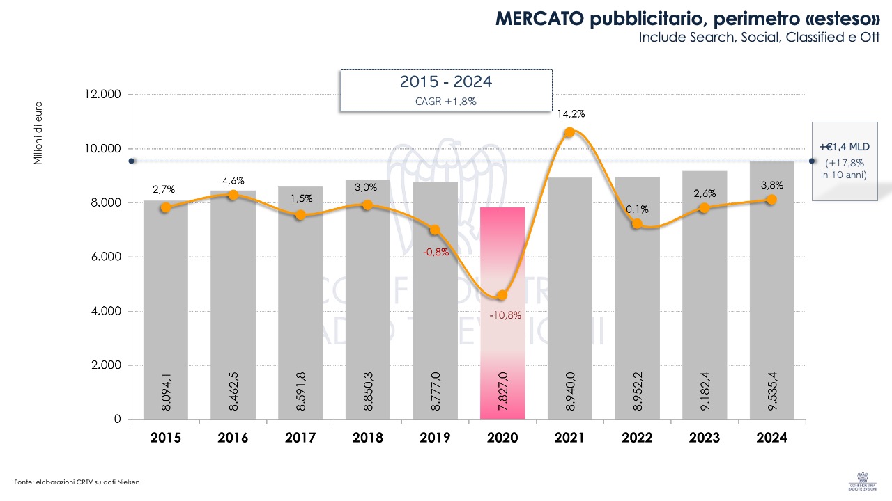 Il mercato pubblicitario, nella sua dimensione “estesa”, ovvero includendo le componenti Search, Social e Classified di INTERNET e dei cosiddetti Over-The-Top (Total DIGITAL), ha chiuso il 2024 a circa 9,5 miliardi di euro, in aumento del 3,8% rispetto all’anno precedente. Nel medio-lungo periodo (2015 – 2024), il mercato cresce di circa 1,4 miliardi di euro con un tasso medio annuo del +1,8% e accorcia la distanza dai valori del 2008 (-1,3%), anno in cui aveva toccato il suo massimo assoluto (9,7 miliardi di euro).