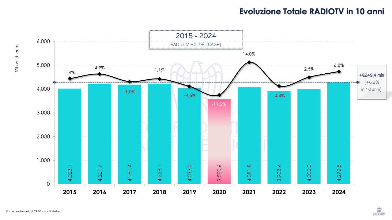 TELEVISIONE. La Televisione chiude l’ultimo anno con un andamento che conferma un buono stato di salute, soprattutto nei mesi estivi (Europei di calcio in Germania e Giochi Olimpici di Parigi). Nel singolo mese di dicembre, la Televisione registra una diminuzione dell’1,6%, totalizzando su base annua 3,86 miliardi di euro circa che porta ad una crescita cumulata del 7,3% (+264 milioni di euro circa rispetto al 2023).