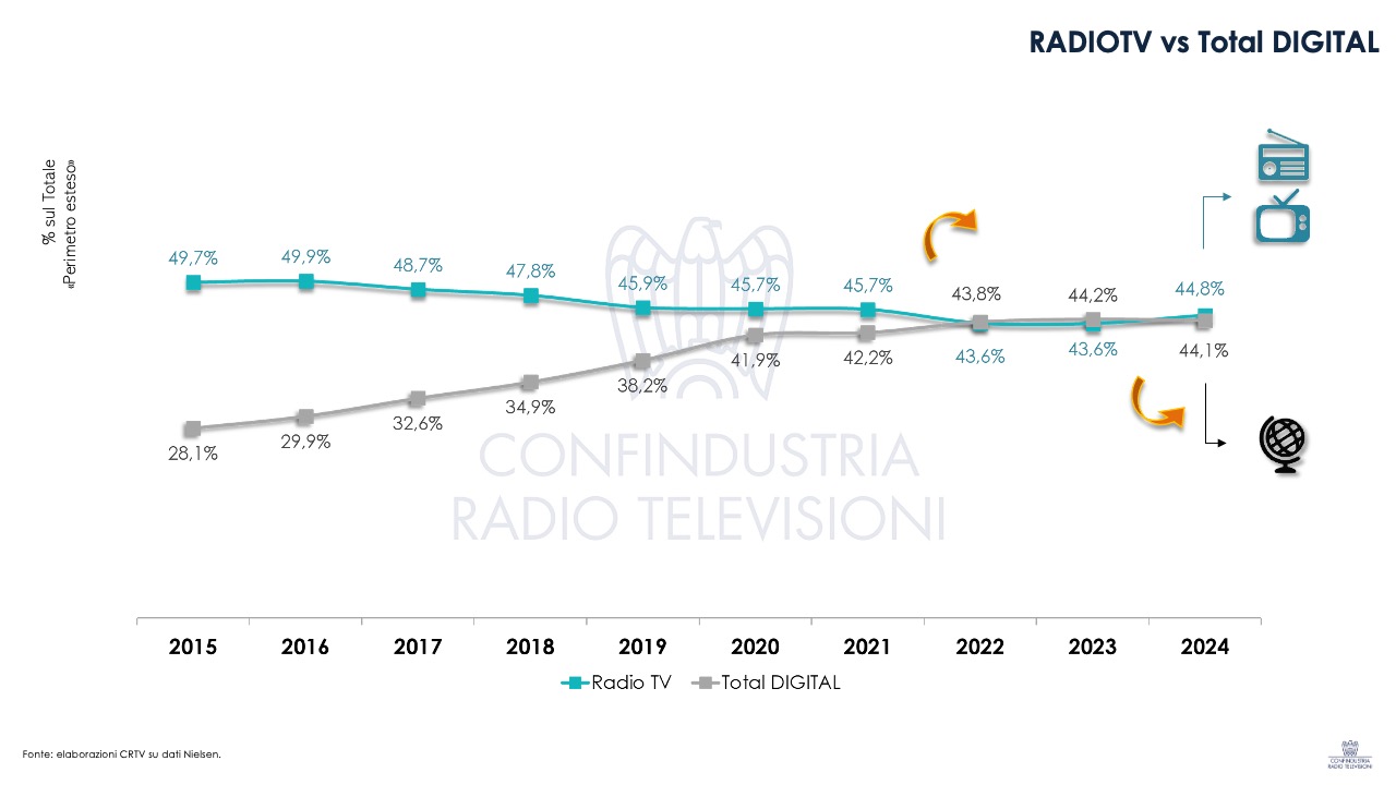 Nel 2024, circa l’87% del valore degli investimenti pubblicitari online (stima Digital Nielsen) può essere riferibile a tali operatori globali, principalmente Google, Facebook e Amazon. La stima del TOTAL Digital registra una quota di mercato sul perimetro “esteso” pari al 44,1%, la Televisione insieme alla Radio si assestano subito prima con una quota del 44,8%.
