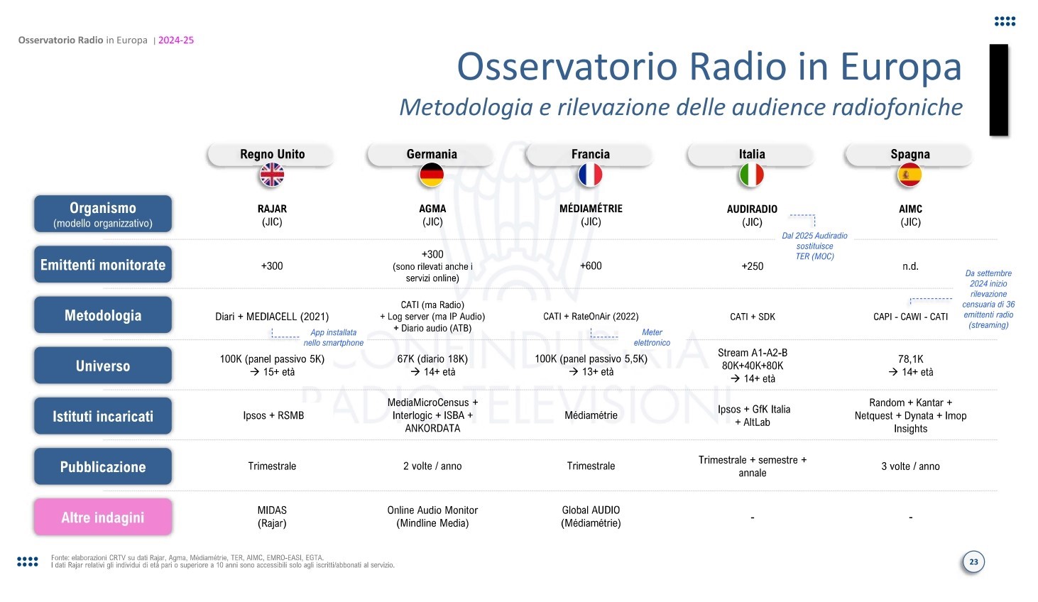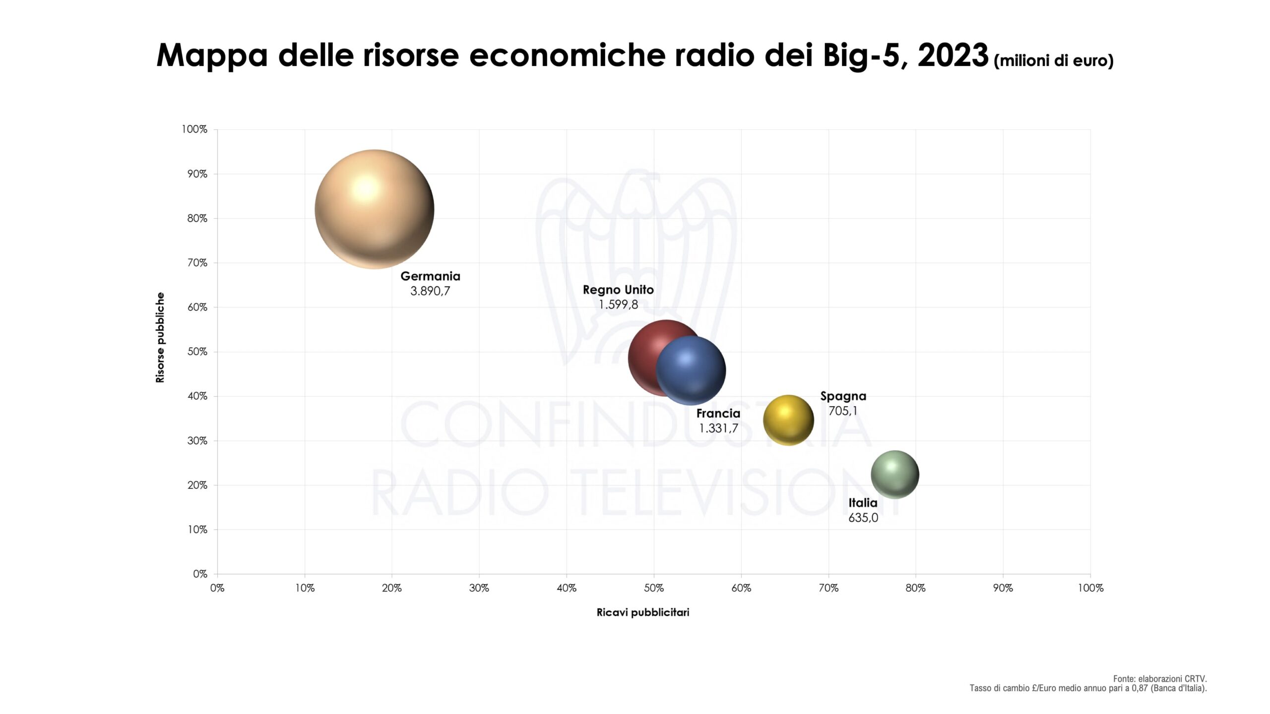 Numeri, modelli e mercati. I sistemi radio nei Big-5 restano fondati su un modello misto pubblico-privato, ma con assetti differenti. Il Regno Unito conta circa 800 emittenti, di cui oltre il 90% locali; in Francia le emittenti locali sono oltre 800, mentre in Italia e Spagna superano rispettivamente 1.700 e 2.000 unità. In Germania, il sistema federale garantisce oltre 500 emittenti private, molte delle quali locali, e solo 3 di servizio pubblico (Deutschlandradio). Il modello di servizio pubblico radiofonico varia: decentrato in Germania e Spagna, misto in Regno Unito e Francia, centralista in Italia, dove la RAI è l’unico operatore pubblico con presenza nazionale e una marginale articolazione locale.
