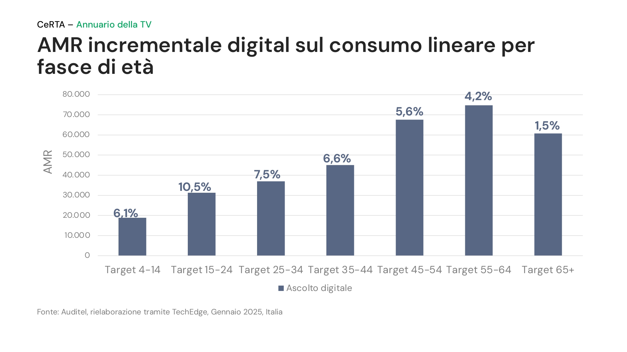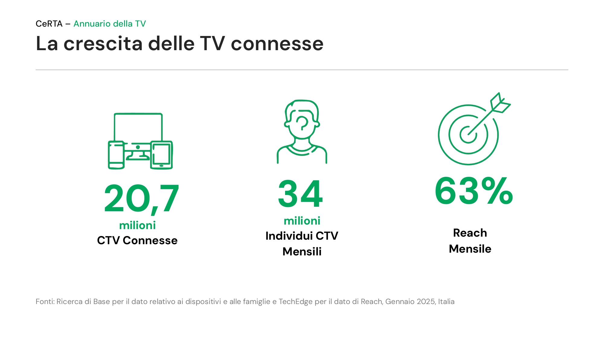 A inizio 2025, si contano 20,7 milioni di tv connesse – un incremento di 2,4 milioni di apparecchi sull’anno precedente, secondo i dati della Ricerca di Base Auditel – per una reach mensile di 34 milioni di individui.
