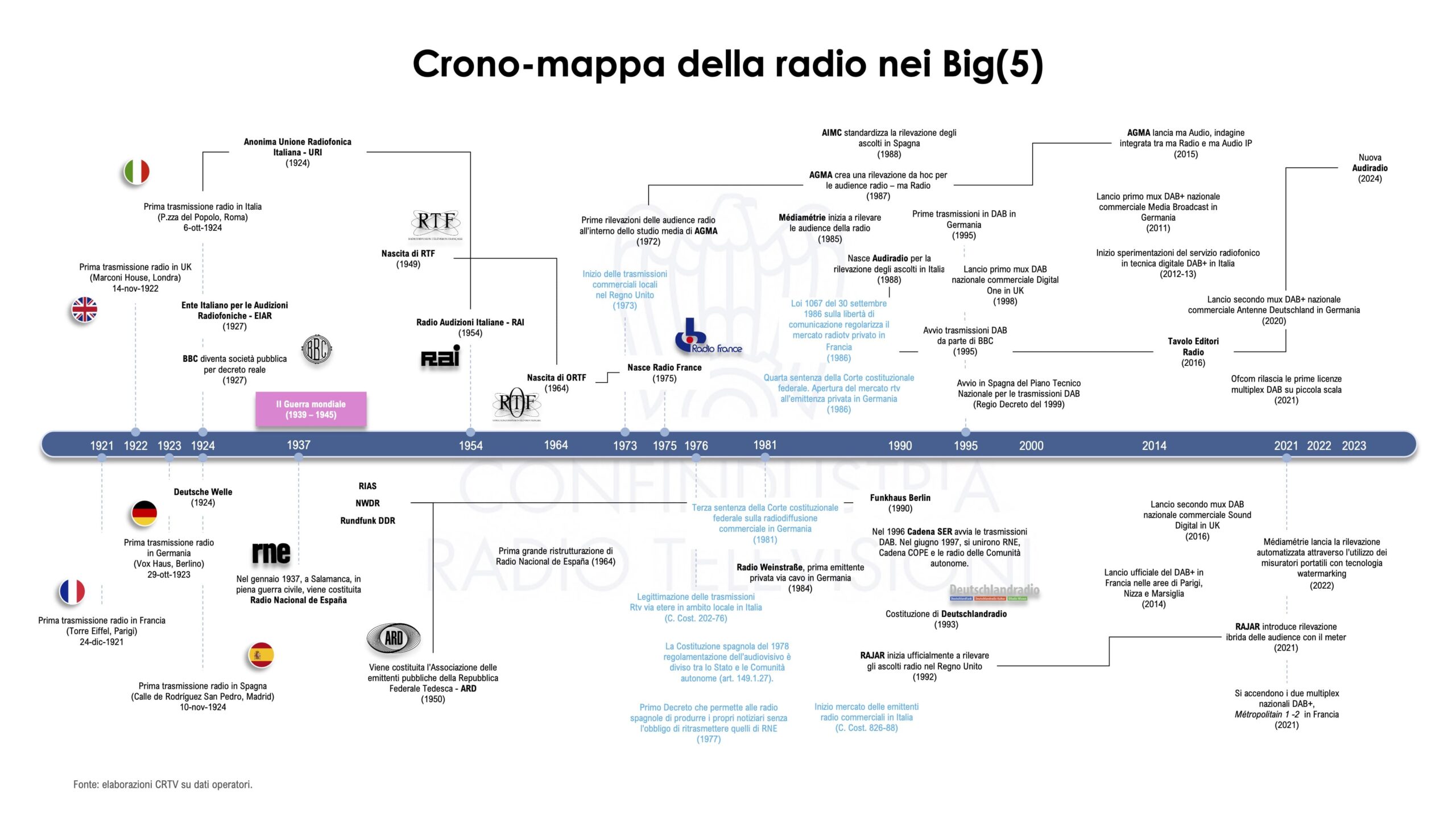 Quadro storico: nascita e sviluppo del modello misto pubblico-privato. Tutti i Paesi europei analizzati Big(5) hanno celebrato, nell’ultimo periodo, il centenario del mezzo radiofonico nato a cavallo del triennio 1921-1924 evidenziando una particolare caratteristica in comune: in ogni territorio, le prime trasmissioni sono state avviate sempre nella stagione autunnale tra ottobre e dicembre.
