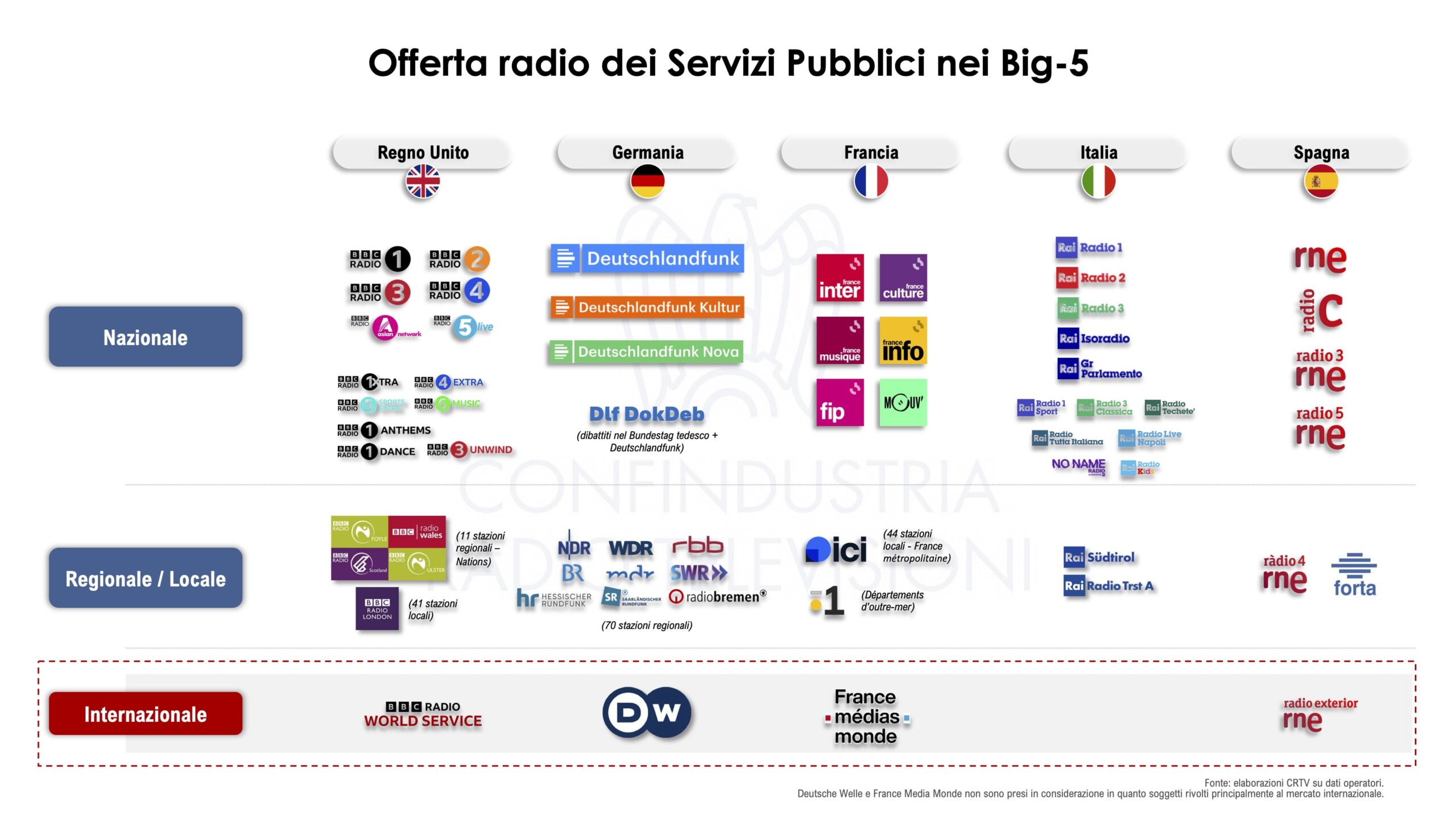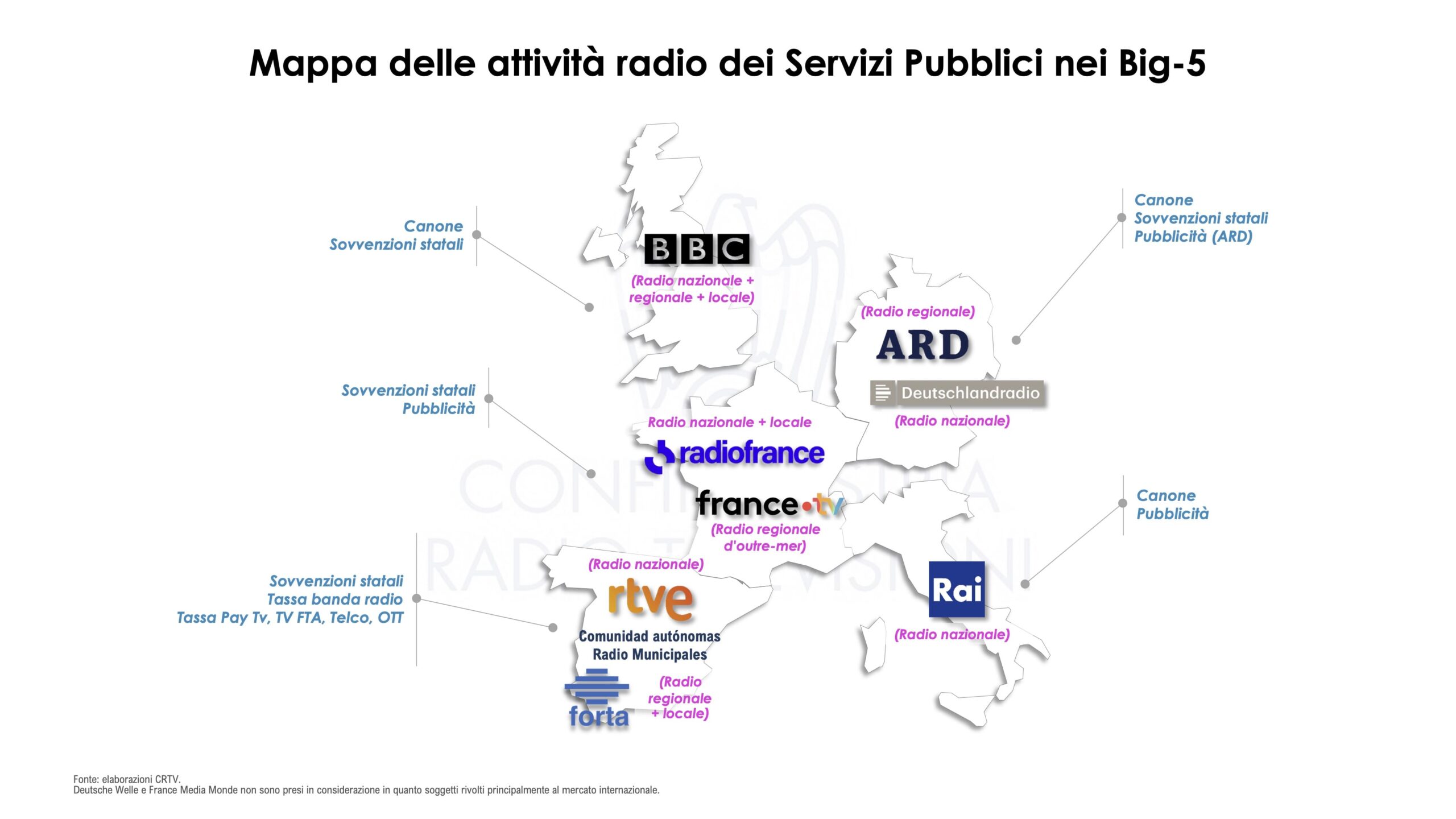 Diversamente in Germania, Francia e in parte Spagna, più soggetti “specializzati” si distribuiscono le attività rtv in ambito nazionale (Radio France, Deutschlandradio, RTVE) affiancati da altri per quello regionale/ locale (ARD, FTV, Comunità Autonome + Municipales). In aggiunta, Francia e Germania contano ulteriori realtà di natura pubblica, finanziate, in questo caso, direttamente dallo Stato, che gestiscono le attività radiofoniche (e televisive) a livello internazionale (Deutsche Welle in Germania e France Media Monde in Francia).