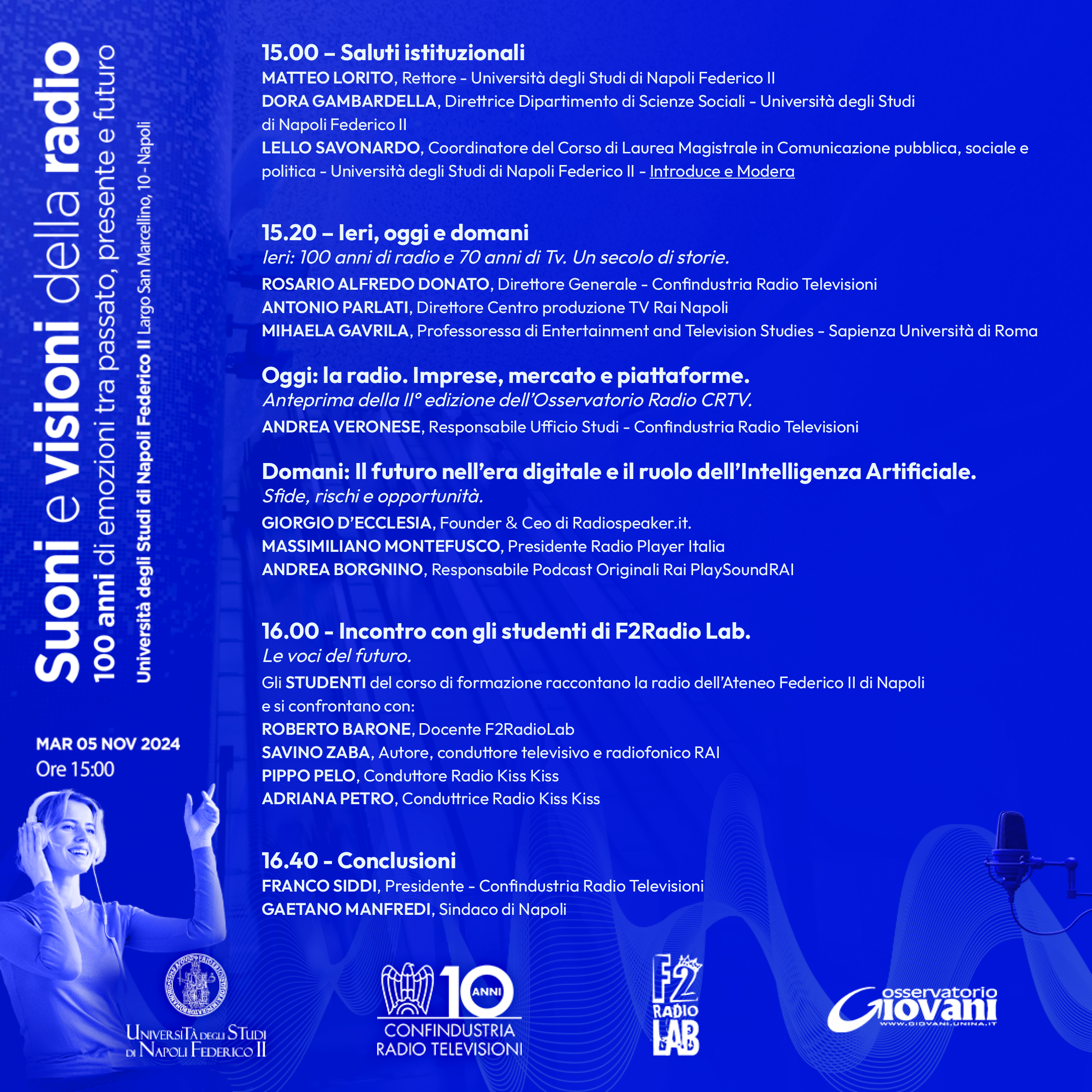 Il convegno intende alimentare il dibattito scientifico e culturale sui processi evolutivi del mezzo radiofonico con i protagonisti, editori e speaker, con i giovani studenti dell’Università Federico II di Napoli e i relativi laboratori creativi: Osservatorio Giovani, F2 RadioLab e Audiovisual Napoli Hub (di quest’ultima iniziativa CRTV è partner).
