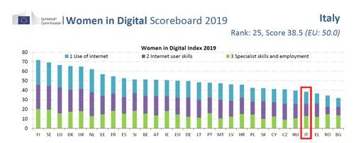 Divario di genere digitale. In concomitanza è stato pubblicato l’indice (Women in Digital Scoreboard), sulla partecipazione delle donne alla digitalizzazione. Il monitoraggio, giunto al secondoanno evidenzia che i paesi dell’UE con un elevato livello di competitività digitale sono quelli che registrano anche la maggiore partecipazione delle donne all’economia digitale. Dal report risulta che: