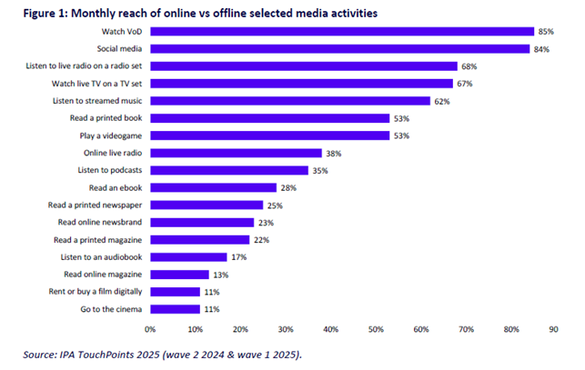 Nonostante l’avanzata del digitale, oltre due terzi degli adulti britannici continuano a guardare la TV in diretta e ad ascoltare la radio ogni mese. Il nuovo rapporto Media Nations 2025 di Ofcom conferma la tenuta dei media tradizionali nel Regno Unito. La televisione lineare resta seguita dal 68% degli adulti, mentre il 67% continua ad ascoltare la radio tramite un apparecchio tradizionale, dimostrando la resilienza di questi mezzi di fronte alla concorrenza di servizi on demand e social media (dati mensili). Il digitale domina tra le attività più diffuse: l’85% degli adulti utilizza servizi di video on demand (VoD) e l’84% i social media.