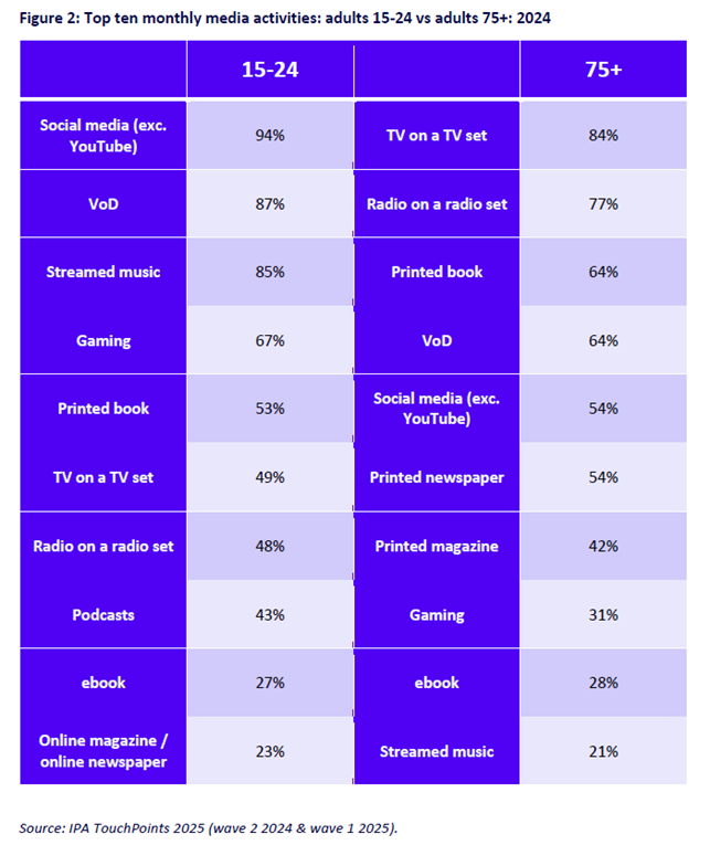 Ma le differenze generazionali sono marcate: tra i 15-24enni i social media raggiungono il 94% di utilizzo mensile, mentre meno della metà guarda TV o ascolta radio in modo tradizionale. Al contrario, gli over 75 restano fortemente legati a televisione e radio, pur mostrando crescente interesse per VoD (64%) e social (54%).