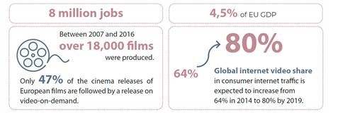 Ciò premesso, l’infografica appena pubblicata sulla newsletter della Commissione UE dedicata al Mercato Unico Digitale ha il pregio di fare il punto sul valore attuale e per l’impatto in Rete dell’audiovisivo UE. E per ricordare alcune caratteristiche della politica dei fondi e degli incentivi messi in campo per il cinema e dell’audiovisivo. Ci riferiamo in particolare sul Programma Media, per il quale la Commissione ha proposto di aumentare i budget a lungo termine (2021-2017) (1,85 miliardi di euro, erano 1,46 nel periodo precedente) e per il programma Media (1,081 miliardi il proposto , 817 attuali).